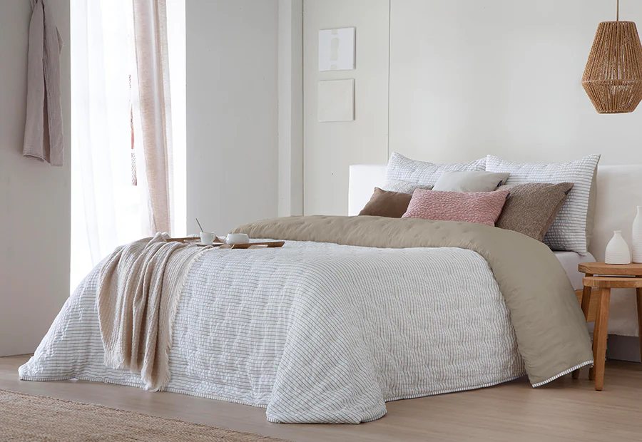 Bouti edredón comforter de entretiempo en tejido jacquard a rayas de la marca Fundeco by Antilo. Diseño elegante y sofisticado. Relleno tacto pluma. Modelo reversible con dos caras diferentes. Garantía de máxima calidad. Packaging en bolsa estilo maleta de pvc con cierre en cremallera y fotolito impreso. Tacto ultra suave – Soft touch