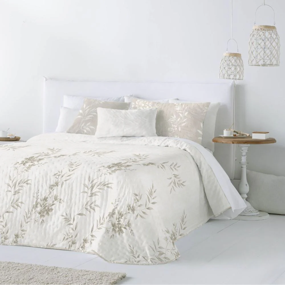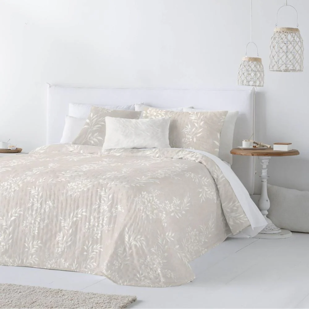 Colcha Bouti July, en color beige, de la marca Fun&Deco. Colcha bouti reversible con un diseño elegante y actual floreado. Cuenta con un acolchado fino que lo hace ideal para los meses de entretiempo y verano. La cara externa tiene un diseño de flores en tonos beiges sobre fondo blanco y el reverso es en fondo beige con flores. Acabado con esquinas redondeadas. Incluye 1 o 2 fundas de cojín de 50×70 cm (dependiendo de la medida de cama escogida).