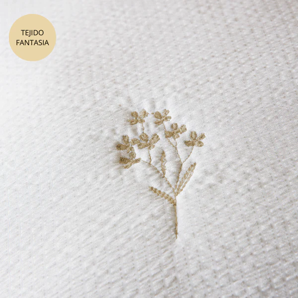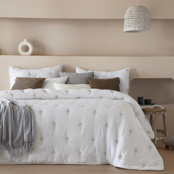 Colcha bouti comforter de entretiempo de la marca Fundeco by Antilo modelo Nadine con flores en color beige.Esta elegante Bouti bordada con tejido fantasía aporta un aire sofisticado y acogedor al dormitorio. Con un diseño en tono blanco, realzado por delicados bordados florales en tonos suaves, combina a la perfección la sencillez con el detalle artesanal. Su relleno tacto pluma lo convierte en ligero y acolchado siendo la opción ideal para vestir la cama con estilo, frescura y un toque de distinción.
