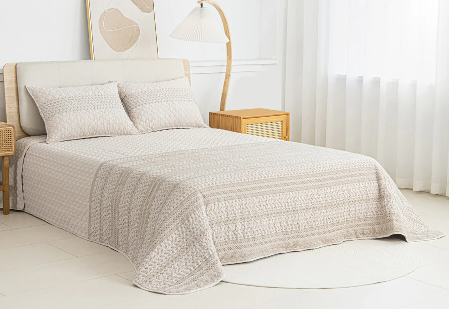 Colcha bouti bordada modelo Lautrec beige en acolchado fino cosido de la marca Clara Vidal. Soft Touch – Tacto ultra suave. Acolchado cosido fino para verano. Diseño y calidad sin igual.