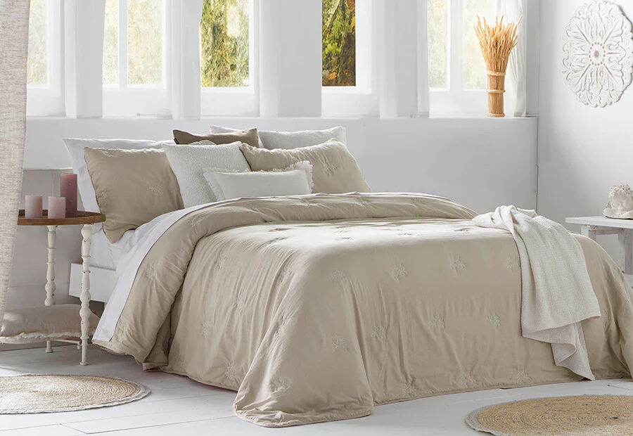 Colcha bouti lisa bordada en acolchado fino cosido de la marca Fundeco by Antilo modelo Amalia color lino. Estilo muy cuidado de tendencia.